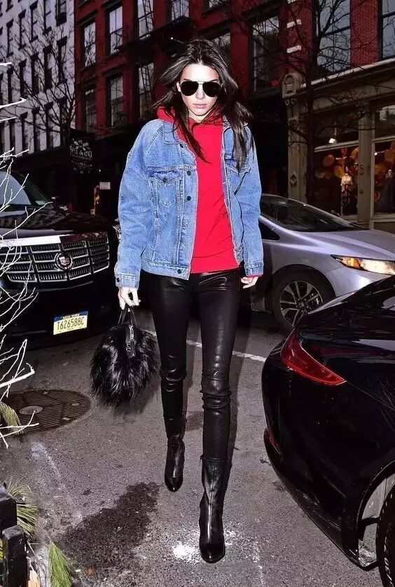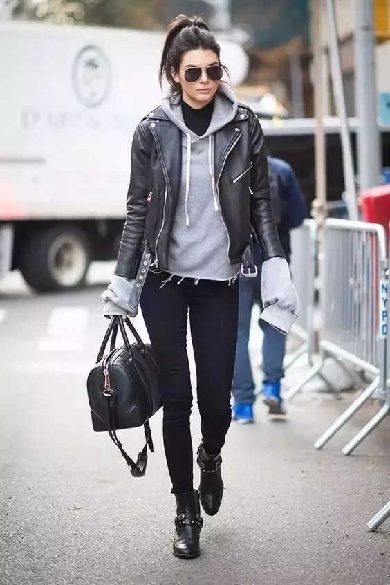 金小妹Kendall黑色皮质夹克搭配灰色连帽卫衣,酷劲十足气场直升~▼