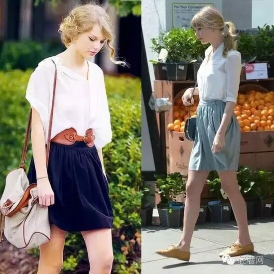 说到凸显女人味,百褶裙真是无往不利,不过要注意,百褶裙蓬蓬的效果很容易显臀大。如何解决呢?留意一下,霉霉穿百褶裙的长度都是在大腿中部,短裙料子没长裙那么重,裙摆能够散开,呈A字效果,修饰了臀部线条!大家有没有发现霉霉很爱穿这种长度的裙子?下面还会继续说哦。