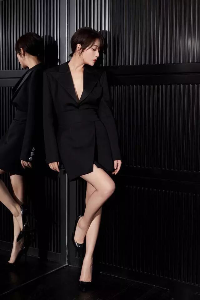一款黑色西装裙也被殷桃穿出了商务女神范儿,这件裙子为西装样式,面料光滑有质感。无论是日常穿搭还是出席活动,都不免为一件时尚单品。经典的斑驳领款式,加上收腰的设计,都让这件衣服整体提升了一个level。短款的样式加上黑色高跟鞋,让殷桃浑身上下都充斥着一股性感女人的韵味。