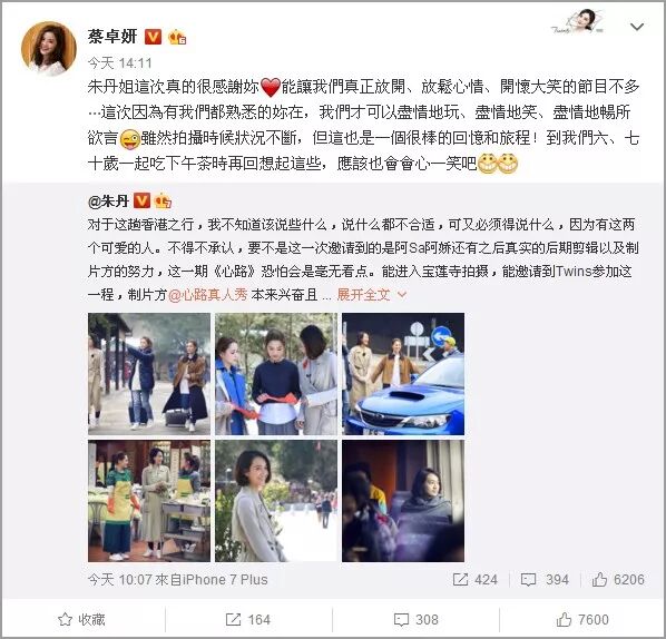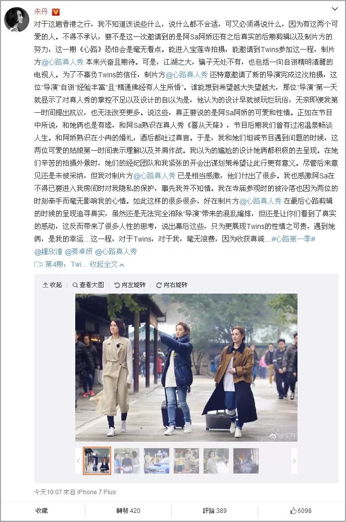 朱丹:对于这趟香港之行,我不知道该说些什么,说什么都不合适,可又必须得说什么,因为有这两个可爱的人。不得不承认,要不是这一次邀请到的是阿Sa阿娇还有之后真实的后期剪辑以及制片方的努力,这一期《心路》恐怕会是毫无看点。能进入宝莲寺拍摄,能邀请到Twins参加这一程,制片方@心路真人秀 本来兴奋且期待。可是,江湖之大,骗子无处不有,也包括一向自诩精明清醒的电视人。为了不辜负Twins的信任,制片方@心路真人秀 还特意邀请了新的导演完成这次拍摄,这位“导演”自诩“经验丰富”且“精通佛经有人生所悟”。谁能想到希望越大失望越大,那位“导演”第一天就显示了对真人秀的掌控不足以及设计的自以为是,他认为的设计早就被玩烂玩俗,无奈即便我第一时间提出抗议,也无法改变更多。说这些,真正要说的是阿Sa阿娇的可爱和性情。正如在节目中所说,和她俩也是有缘,和阿Sa熟识在真人秀《喜从天降》,节目后期我们曾有过泡温泉畅谈人生。和阿娇熟识在小冉的婚礼,酒后都吐过真言。于是,我和她们坦诚节目遇到问题的时候,这两位可爱的姑娘第一时间表示理解以及并肩作战。我以为的尴尬的设计她俩都积极的去呈现。在她们辛苦的拍摄外景时,她们的经纪团队和我紧张的开会出谋划策希望让此行更有意义。尽管后来意见还是未被采纳,但我对制片方@心路真人秀 已是相当感激,他们付出了很多。我也感激阿Sa在不得已要进入我房间时对我隐私的保护,事先我并不知情。我在寺庙参观时的被冷落也因为两位的时刻牵手而毫无影响我的心情。如此这样的很多很多,好在制片方@心路真人秀 在最后心路剪辑的时候的呈现追寻真实,虽然还是无法完全消除“导演”带来的混乱编排,但还是让你们看到了真实的感动,这反而带来了很多人性的思考,说出幕后这些,只为更展现Twins的性情之可贵,遇到她俩,是我的幸运…这一程,对于Twins,对于我,毫无浪费,因为收获真诚…#心路第一季# @鍾欣潼 @蔡卓妍 @心路真人秀
