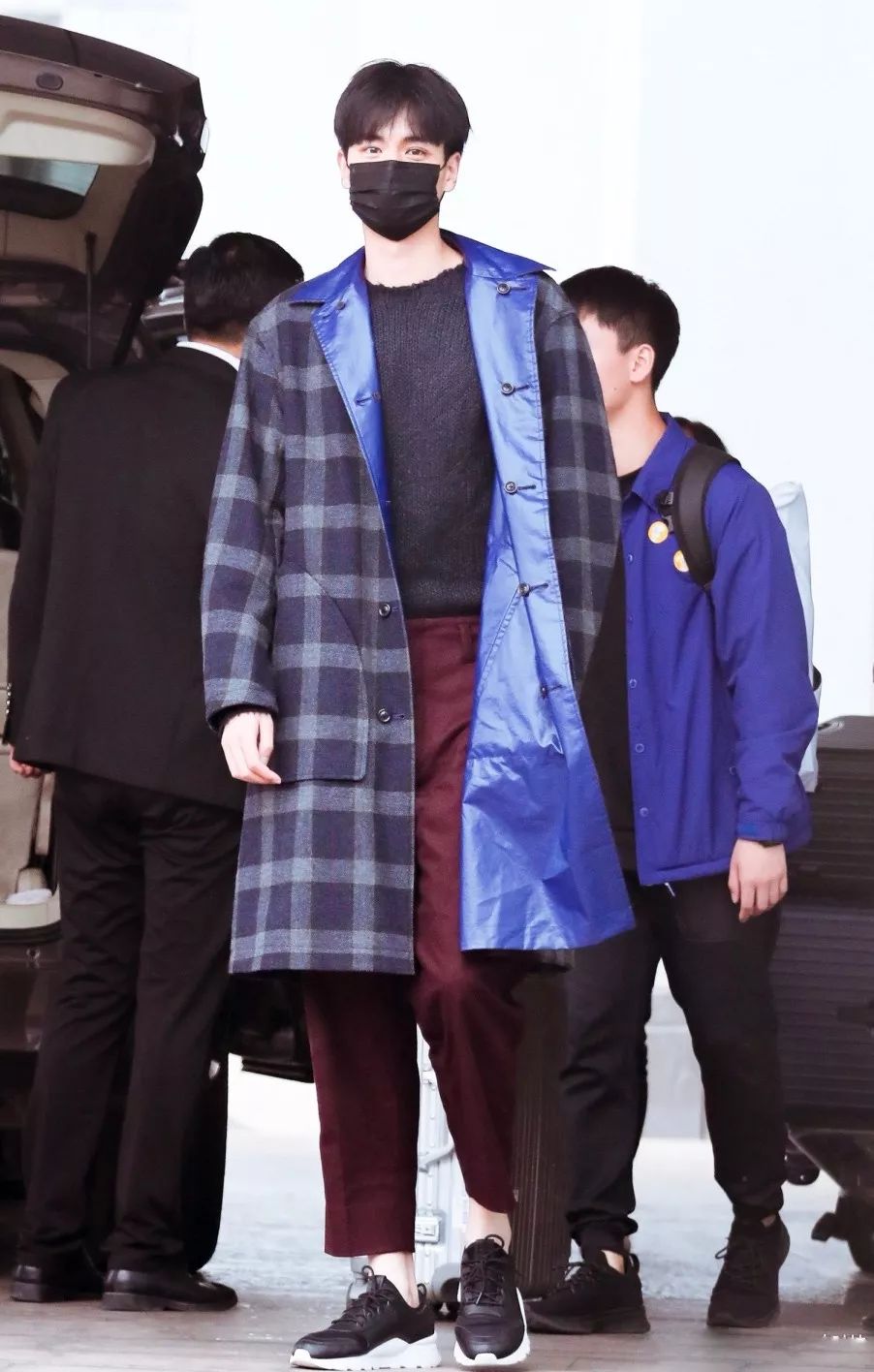 胡一天北京机场街拍,拼接格纹大衣搭牛红色裤子,低调的撞色。