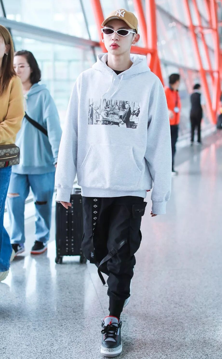郑恺现身上海机场,身穿灰白色连帽卫衣,搭配休闲牛仔裤,穿白色运动鞋,灰色棒球帽反扣,潇洒随性。