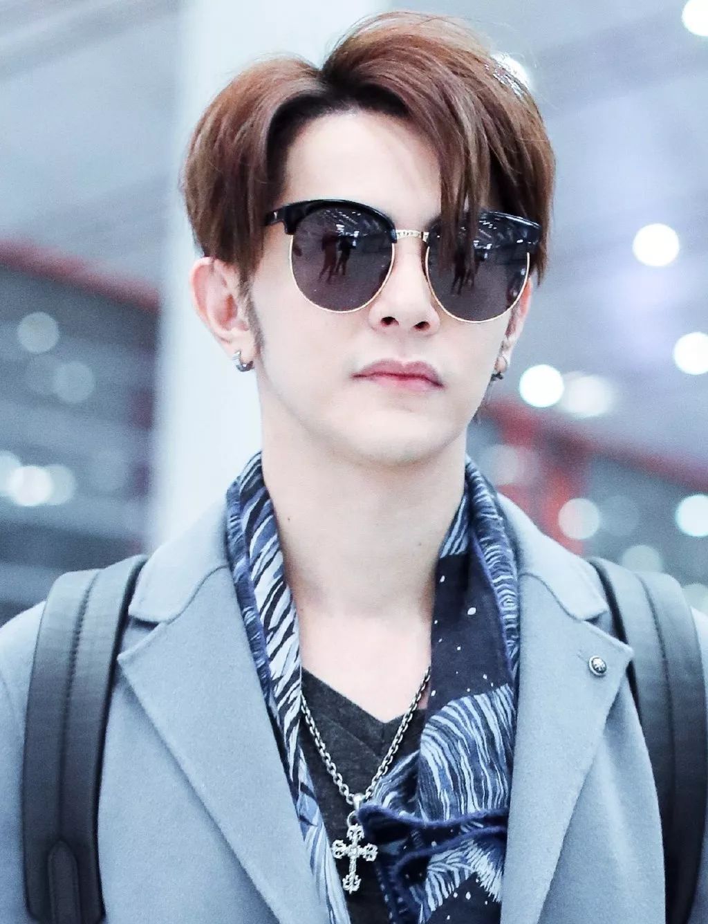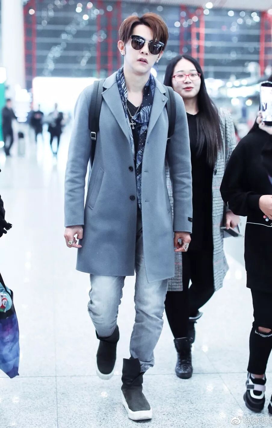 汪东城北京机场街拍黑色T恤搭灰色大衣,印花围巾点缀。