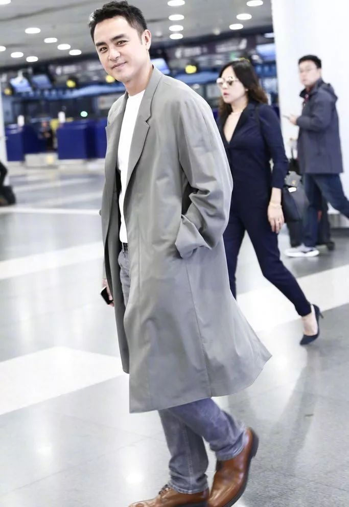 明道现身机场,灰色长款风衣搭牛仔裤,气势十足。