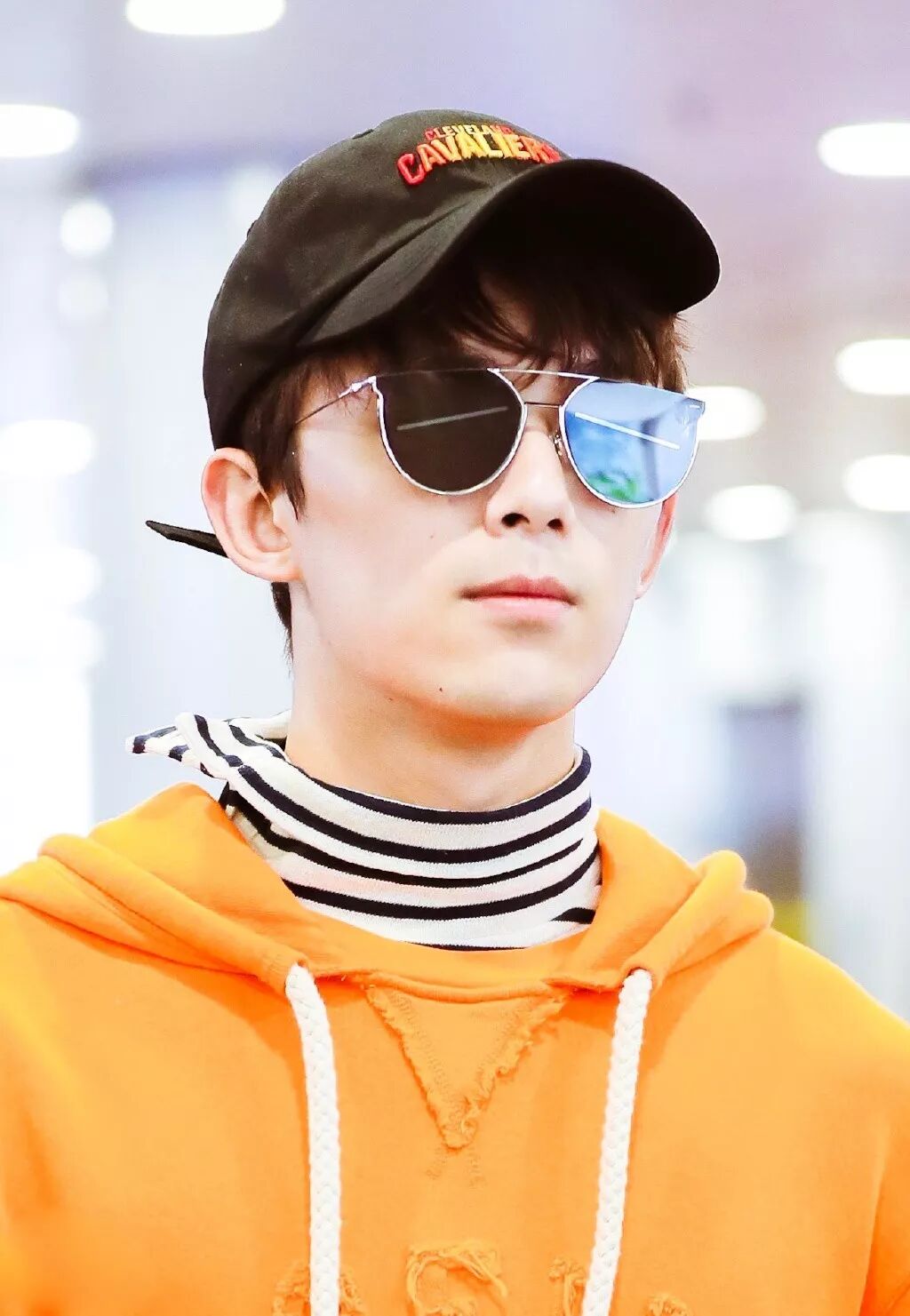吴磊现身机场,橘色连帽卫衣叠穿条纹高领内搭,下身搭卷边牛仔裤,活力满满。