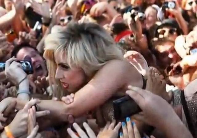 2010年8月6日,芝加哥,Lady Gaga现身芝加哥Lollapalooza音乐节会场。在演出中,Lady Gaga扑向粉丝,遭到各种“揩油”。