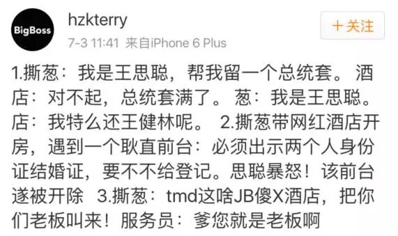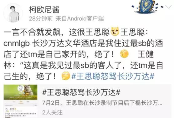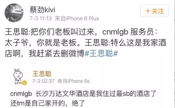 然而在今日凌晨,王公子怒发微博,“cnmlgb,长沙万达文华酒店是我住过最sb的酒店了,还tm是自己家开的,绝了!”