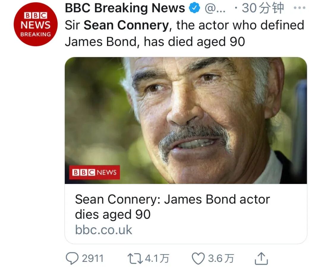 刚刚BBC传来消息,第一任007演员、汤玛斯·肖恩·康纳利爵士(Sir Thomas Sean Connery)逝世,享年90岁。