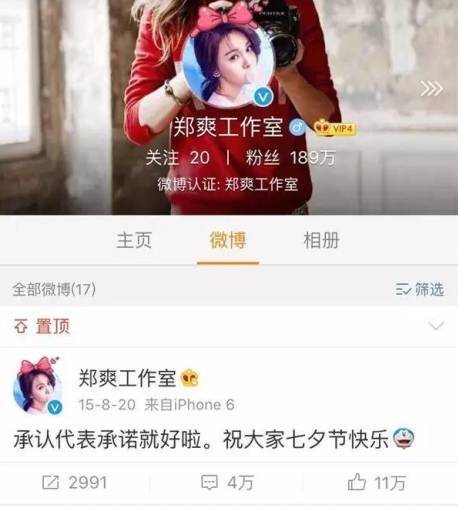 不过圈姐还是心系娱乐圈滴,尤其郑爽胡彦斌这对,前两天胡彦斌被拍到去深圳探班郑爽,还共度一夜,疑似复合的消息,让粉丝纷纷心碎,跑到胡彦斌微博喊话“求放过”,万万没想到的是,郑爽在昨天下午通过工作室官方微博置顶了去年七夕认爱胡彦斌的微博,疑似承认旧情复燃。