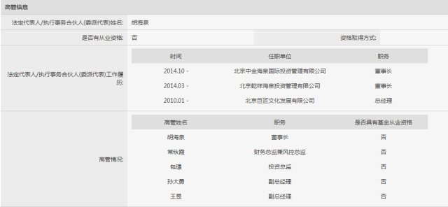 但智慧君在中基协网站上查询发现:不仅是胡海泉,北京乾祥海泉投资管理有限公司的高管中,财物总监兼风控总监常秋霞、投资总监包璟,以及公示的两位副总经理,全部没有基金从业资格。