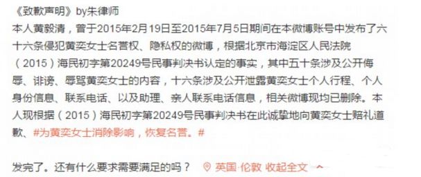 黄毅清大概觉得不能再这样子平静下去了!2015年11月22日,他罕见地发布致歉声明向黄奕道歉,表示已经将之前侵犯黄奕名誉权、隐私权的相关微博都删掉了,并在致歉声明中说 " 愿能帮你重回一线 "。
