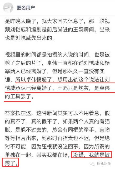 后来还有疑似剧组的工作人员在知乎上回答问题,说刘恺威根本就不是和王鸥独处,她全程都在场,但不是和刘恺威一起进出,所以就被剪了!
