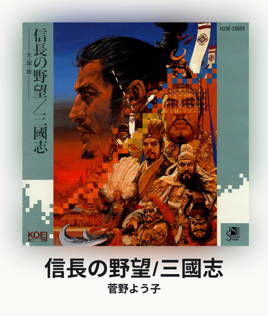 菅野洋子:这也是一样的情况,有人问「有没有谁会作曲啊?」,于是我就和光荣公司的人见了面。对方说明了要求:请创作20首曲子,分别是信长的主题曲、信长殒命的主题曲等等;可用的音只有两个旋律音和一个节奏音(译注:早期游戏音源芯片的声道分配限制,留给音乐的只有极有限的单音)……我听完后就应承下来「好的,明白了」,然后把谱子写好,过几天交过去——当时的感觉真的和批改试卷的打工没差多少。说到底,我那时根本不知道电脑游戏是什么,也没玩过,连游戏画面都没怎么好好看过。但现在回头想来,当时的那份「无知」或许反而是件好事。因为信息有限,我只能在自己脑海里尽情地构筑想象,然后将其化为音乐。