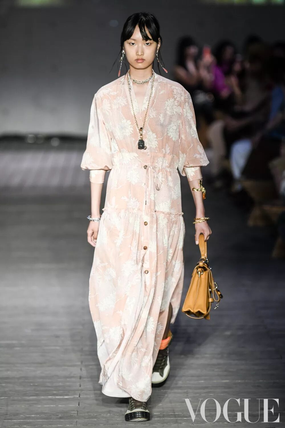 对印花和刺绣的把玩,颂扬着上海的美好年代——从 Chloé 档案馆里发掘的Art Deco艺术装饰风格几何标识图纹Logo,到花蕾及花朵盛放的图景相应交辉。并与 Chloé 经典的中性色融合,它们在瓷漆的色彩上绽放:柿色、樱桃色、赤陶、棕土、藏红花色、矢车菊蓝。