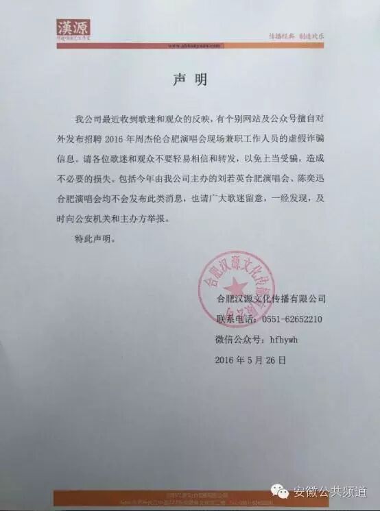 7月16日刘若英“Renext我敢”世界巡回演唱会合肥站、陈奕迅“Another Eason´s Life”演唱会合肥站、周杰伦“地表最强”世界巡回演唱会合肥站,均已经进入筹备阶段,近日据歌迷反映,有部分网站及公众号擅自发布演唱会志愿者招募信息,汉源团队在此声明:演唱会需由专业团队及人员运作,我们不会发布招募志愿者的相关信息,请广大歌迷提高警惕,谨防泄露个人信息;对于谣言散布者,我们将保留追究其法律责任的权利。