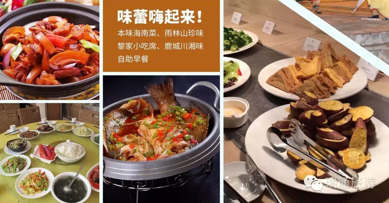 三亚味道:全程自助早餐,风味正餐:“雨林山珍味”特色餐、“黎家特色席”、“本味海南菜”、“鹿城川湘味”