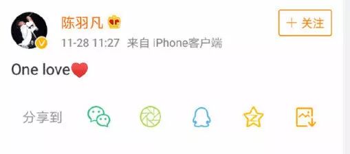 随后是陈羽凡本人也发了微博,只有两个单词:one love,也是让人摸不着头脑。