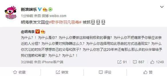 胡海泉也发了微博,琼瑶上身地一口气发了N个为什么,表示痛心疾首。