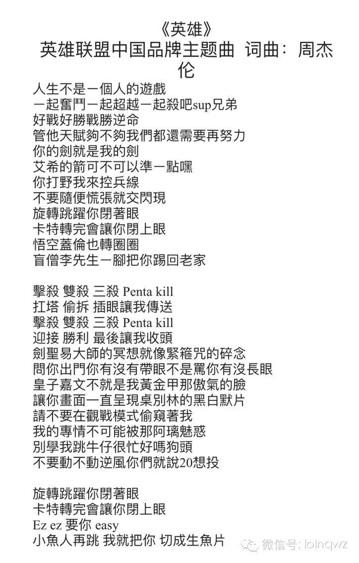 这句歌词中的前两句出自于英雄联盟官方的宣传词“人生不是一个人的游戏,英雄一起去超越”,不知道大家在听这句歌词的时候有没有想到这个呢?值得一提的是“一起杀吧sup兄弟”,有的人知道,也有的人不知道,sup在游戏中的术语指的是辅助。众所周知,辅助这个位置在游戏中一直都是被人忽视的角色,而辅助在游戏中几乎也是死的多人头少,甚至经常会为了不当辅助而争吵起来。周杰伦在这里呼吁大家无论是什么位置都是非常重要的,不容忽视,一起向前,一起发育,一起击杀!