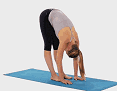 站立在垫子上,躯干以髋部为折点向前向下弯曲,双手按在垫子上;