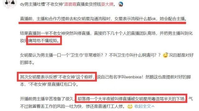 根据男主播的爆料来看,大概意思是说这位香港女明星觉得他不懂规矩、没礼貌,一上来就在卖“卫生巾”,话说得很难听;且更不满意对方一直喊她“不老女神”而不是叫名字。