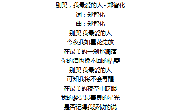 《别哭,我最爱的人》是郑智化演唱一首歌曲,由郑智化作词、作曲。收录在其1990年发行的《单身逃亡》专辑中。