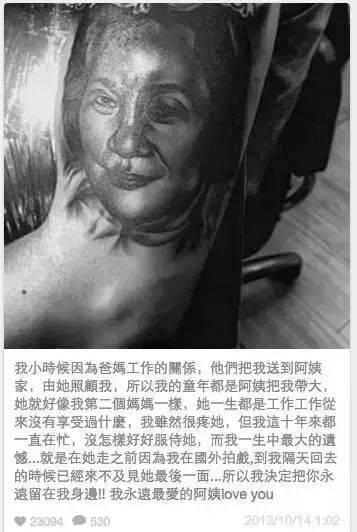 余文乐迷上纹身已不是新鲜事,而其中的纹身图案正是他的阿姨和外婆的肖像。关于自己对阿姨和外婆的深厚感请,阿乐也曾po文说明: