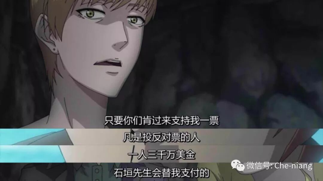 第三集中,出现的人物多了起来,土豪石垣、警察翠西、台湾小哥、德国小哥,俗话说,人多是非多,在众人纠结何去何从,最后要通过选票方式决定去留的问题,其中最让人烧脑的是第二轮的投票,刚看完第一遍,还不明白止痒哥所说的:“石垣先生会支付我三千万美金”是什么鬼!在通过反复回放并结合良心弹幕的解读,就显而易见了:石垣对于去向的主导权势在必得,所以先前用一千万美金拉拢旁人,可如果那原本站在石垣那边的人中有改变选择 选择站到止痒哥这边,那么石垣就需用更多的钱再把这人拉回来才能获得投票的胜利(总共七个人) 那更多的钱便是志杨哥说的“三千万美金”,而这也可以理解为“敲竹杠”,于是第三集的主题也就出来了——利益or盟友。