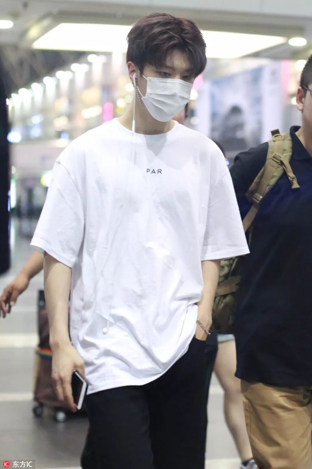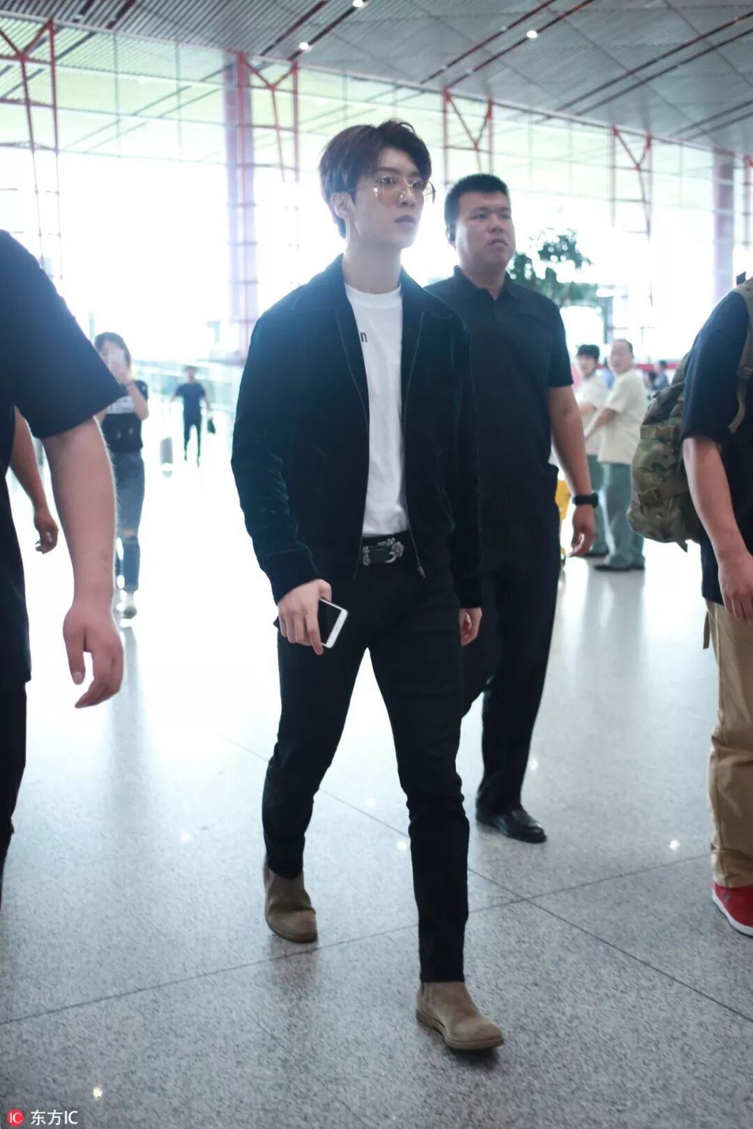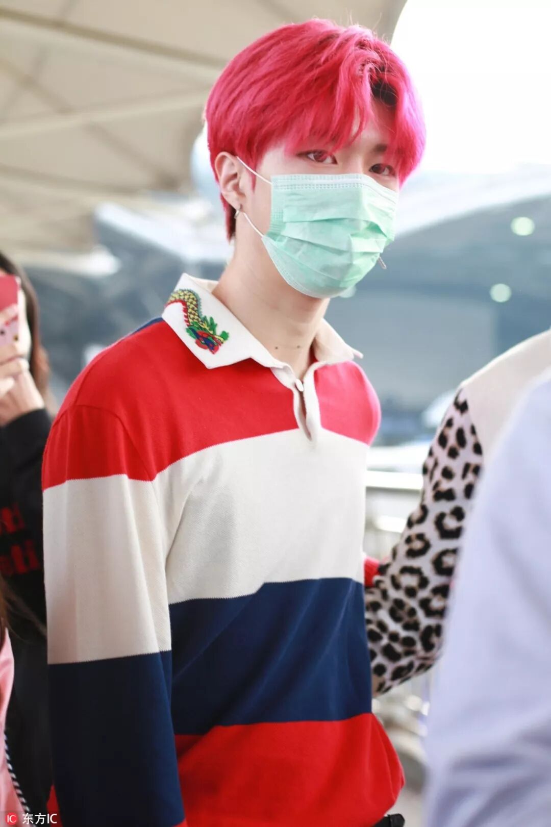 红发造型的他,以红白蓝条纹刺绣卫衣现身机场,上下呼应。
