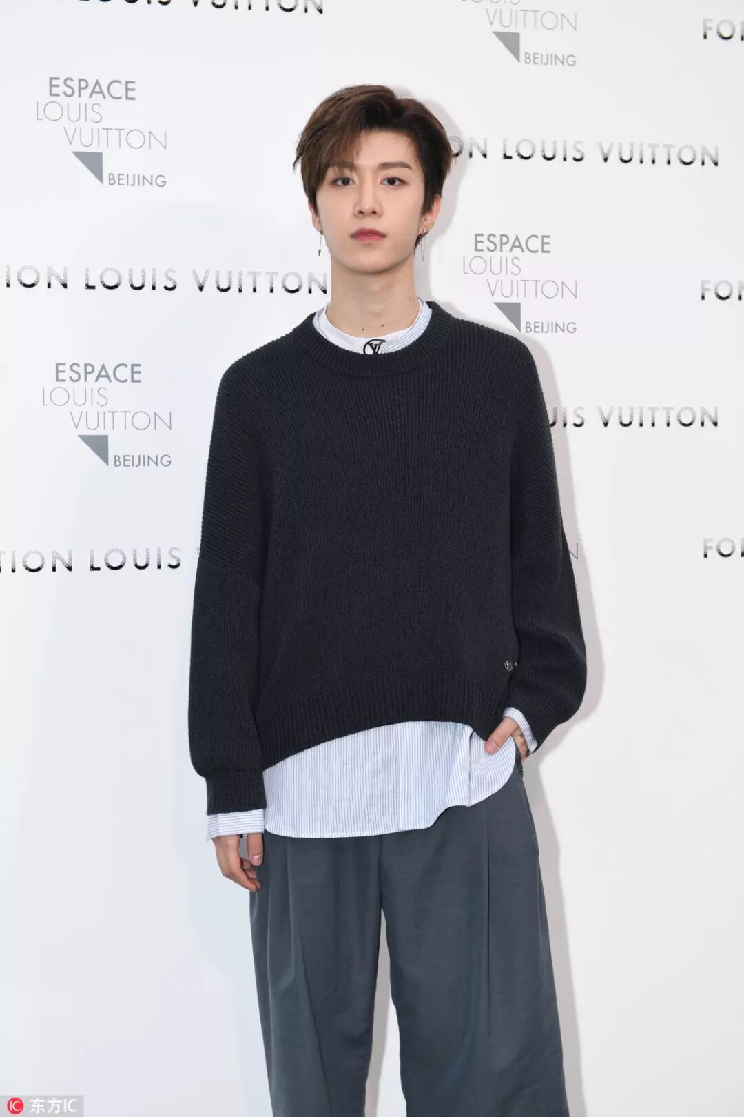 同样是叠穿,区别于运动风格,Louis Vuitton的打底+条纹衬衣+针织衫叠穿也是极好的。
