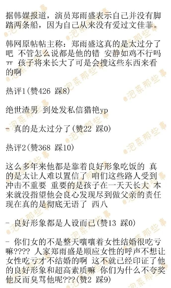 郑雨盛辟谣出轨? 纽约吃喝玩乐 日韩男星 2024-12-17 22:00:30 212 创作不易,用心坚持,欢迎请BaGua喝几杯爱心咖啡!打赏并支持本文 打赏并删除本文 近日,在tvN《Free Doctor》节目中,嘉宾们讨论了郑雨盛脚踏两条船且有私生子的劈腿争议。有熟人声称郑雨盛是在与女友暂时分手的期间见了文佳菲,女友也认识文佳菲。郑雨盛跟文佳菲短暂的来往,但因为是不相爱的关系,所以并没有正式交往,也不会结婚。后来,郑雨盛也很快就跟女友复合。文佳菲去年6月怀孕,今年3月产子。郑雨盛进行了亲子鉴定,亲自定了胎名,还讨论了产后月子中心和抚养费等问题,但在婚姻问题上产生了矛盾。文佳菲想要结婚,但郑雨盛的立场是只负责抚养。 创作不易,用心坚持,欢迎请BaGua喝几杯爱心咖啡!打赏并支持本文 打赏并删除本文 感谢您的支持鼓励,我会继续努力的!文章地址:用户邮箱:打赏金额:USDT 请输入数字点击”去打赏“,即可进行打赏支持本文章哦 郑雨盛 发表评论