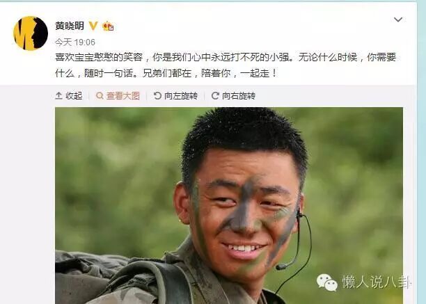 黄晓明在微博霸气表态,称:喜欢宝宝憨憨的笑容,你是我们心中永远打不死的小强。无论什么时候,你需要什么,随时一句话。兄弟们都在,陪着你,一起走!