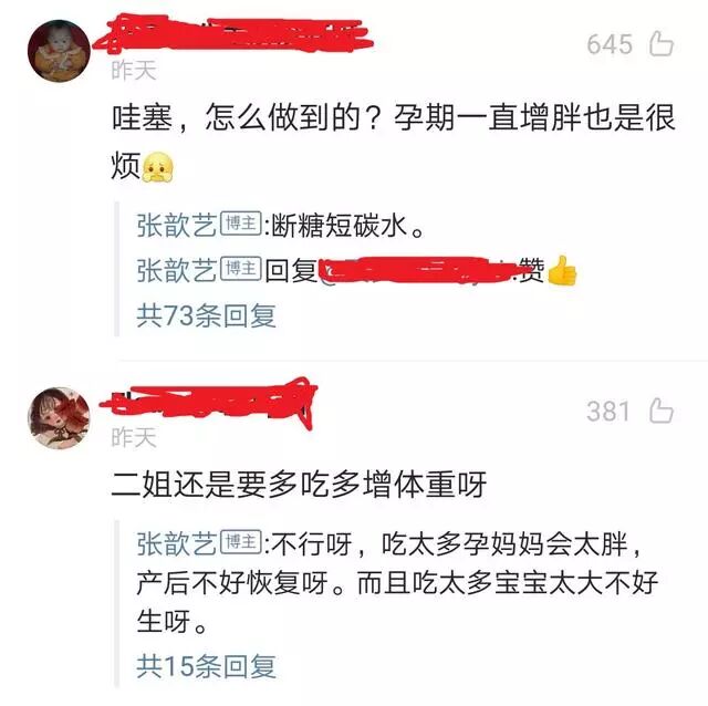 在这条微博下面,张歆艺也是开启了“怀孕小课堂”,讲解了为什么怀孕期间不能变太胖。“断糖短碳水”,“吃太多孕妈妈会变胖,而且产后不好恢复”,“吃太多宝宝太大也不好生”,与网友们开心地交流了起来。