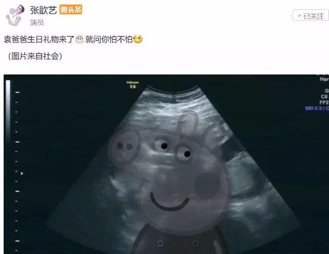 照片中,张歆艺首次晒了宝宝的B超照,超级可爱,是个可爱的小猪哦,把小猪佩奇盖上去,又一次逗趣的黑了一次老公。据悉二姐预产期在明年年初,所以小猪佩奇是金猪宝宝的意思么?张歆艺和袁弘自从在2016年结婚以来,就经常各种秀恩爱,撒狗粮,在娱乐圈中也是一对很让人羡慕的恩爱侣,虽然之前的时候,两个人结婚也是受到了很多的非议,但是还是收获了很多网友们的祝福。