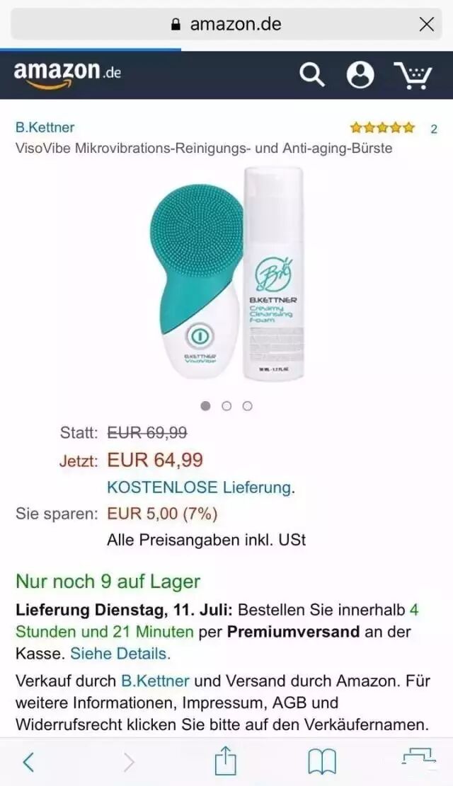 咱们这次团购的碧凯娜洁面仪礼盒,品牌官方在中国的售价是690元,我查了一下德国亚马逊的价格,算上德国高昂的消费税,也要合600多块人民币。而咱们的团购价是598元,差不多85折。