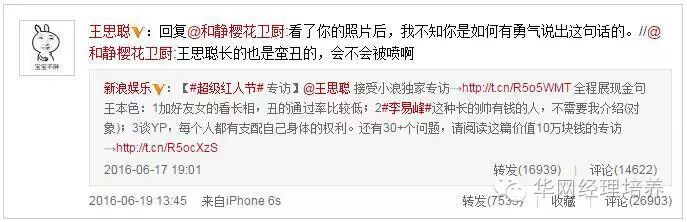 6月16日,王思聪参加超级红人节活动,专访视频竟被网友吐槽丑,王思聪转发回应:“看了你的照片后,我不知你是如何有勇气说出这句话的。”