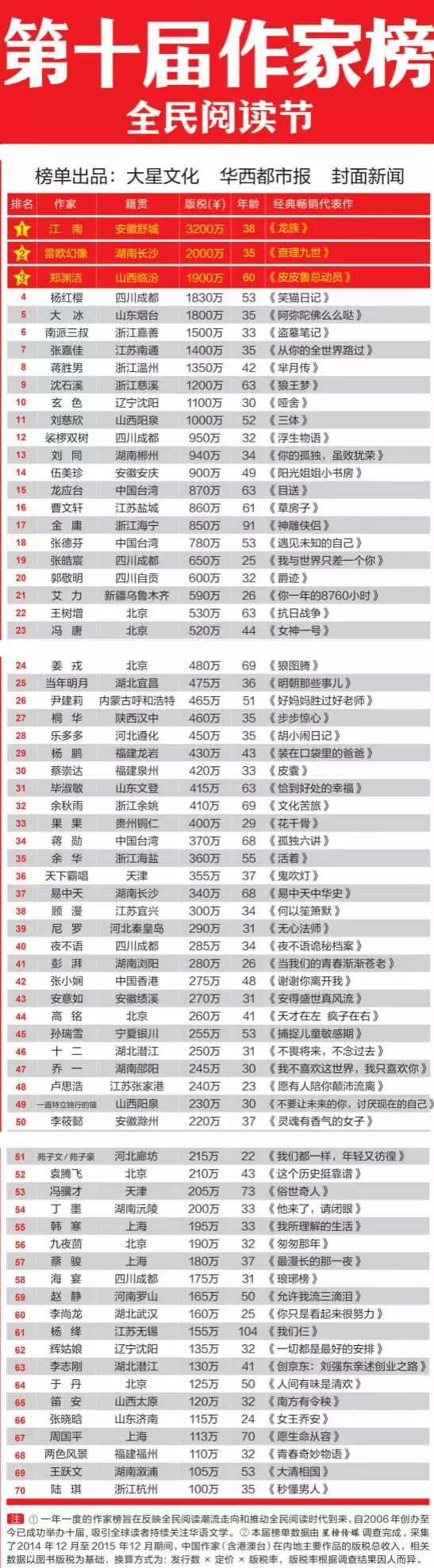万众瞩目的第十届作家榜主榜(3月22日)震撼发布,作家江南以3200万元荣登榜首!雷欧幻像和郑渊洁分别以2000万元、1900万元年度版税收入位列二三名!此次上榜作家人数创新高,总有70名作家荣登榜单!