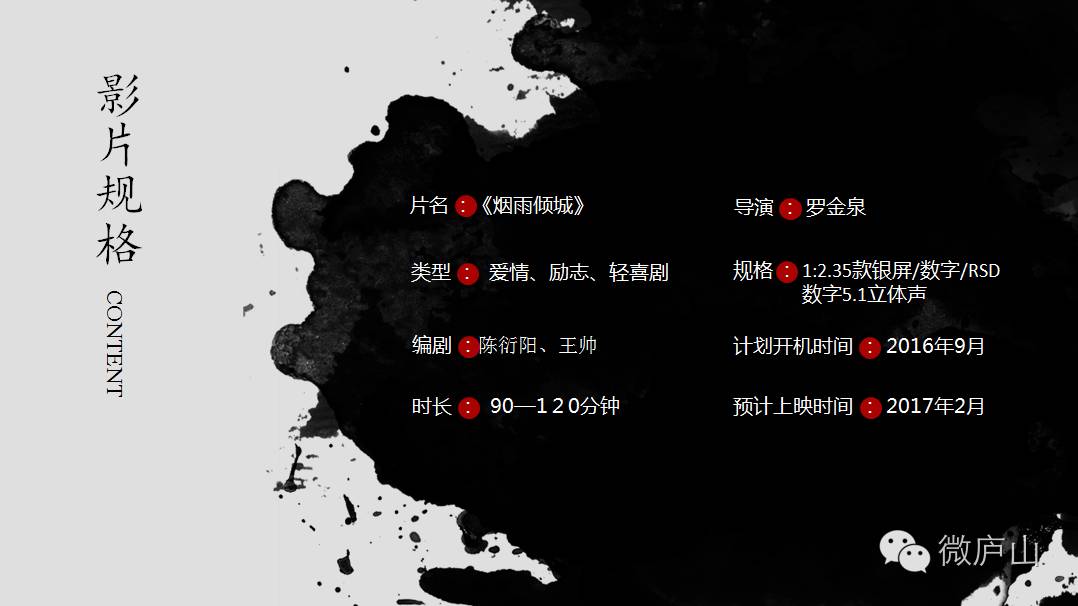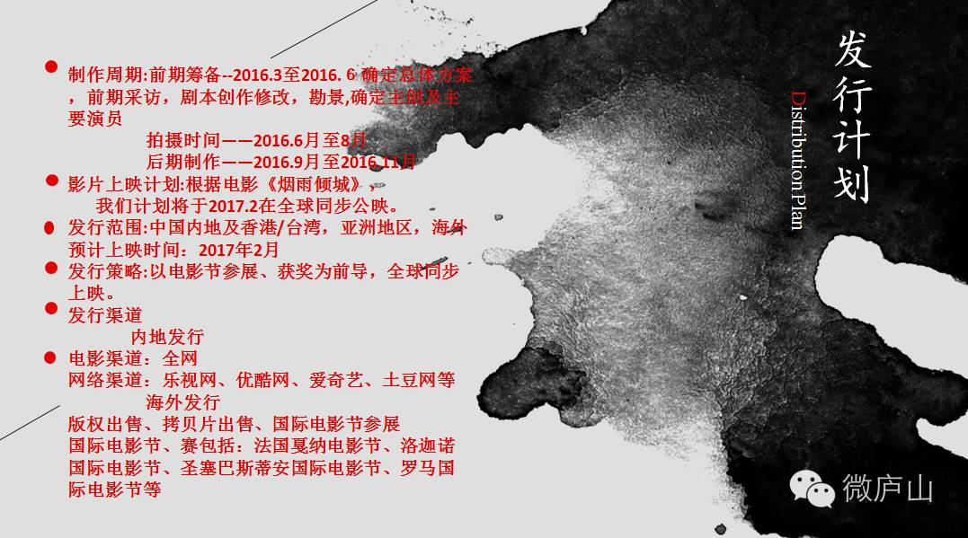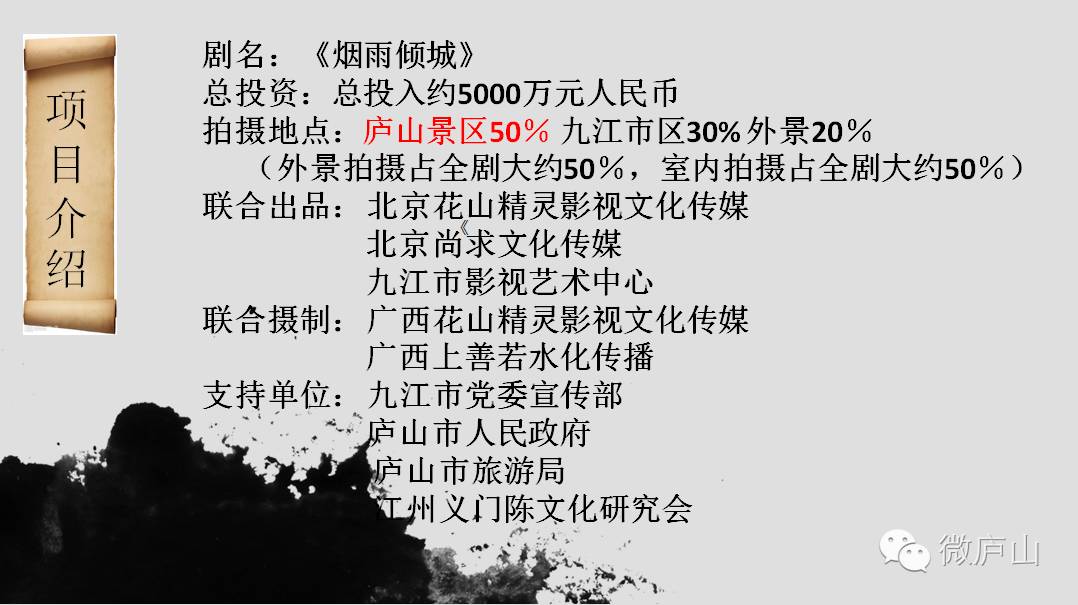 打造庐山的名片,电影是一个最佳的载体。众所周知!1980年所拍摄上映的电影《庐山恋》,从80年代至今一直未间断的播放,《庐山恋》和庐山恋电影院也成为了庐山的一个新的象征和庐山的新地标性景观。但随着时代的发展,那部电影对庐山人文品牌的宣传作用逐渐减弱,在文化名人推荐下,我们拟拍摄以庐山为背景的喜剧、爱情、励志,重塑庐山厚重人文,提升庐山品牌的风光大片《烟雨倾城》电影,这部作品恰逢庐山设市之机,将是设市后做大庐山第一部作品,这部作品得到了九江市有关领导高度重视与支持,并建议定调为庐山设市献礼片!