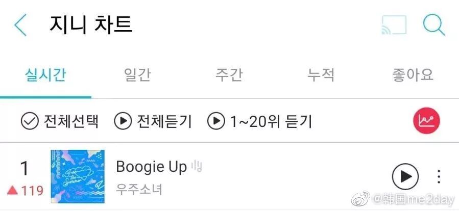 7日,宇宙少女《Boogie Up》获得韩国时间今日7时Genie实时榜单1位,但是就在前一天凌晨,宇宙少女的排名还是120位,突然上升了119位,让人非常怀疑。