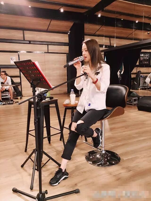 经典百搭的白体恤加上黑色破洞牛仔裤,台下的张韶涵真是十分接地气。认真工作的女人最美啦。