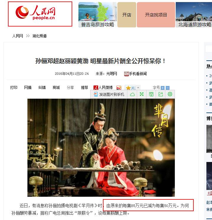 据人民网最新报道,孙俪一集《芈月传》的片酬是85万人民币,因限薪令降低到50万每集。