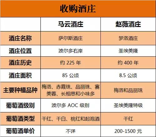 马云收购的萨尔斯酒庄(Chateau de Sours)位于波尔多右岸,距今有 200 多年历史,85 公顷面积,可产干红、干白、桃红及起泡酒等十余款酒。赵薇收购的梦洛酒庄(Chateau Monlot)位于波尔多右岸圣埃美隆产区,距今有 400 多年历史,8.5 公顷面积,只产干红葡萄酒。酒庄。