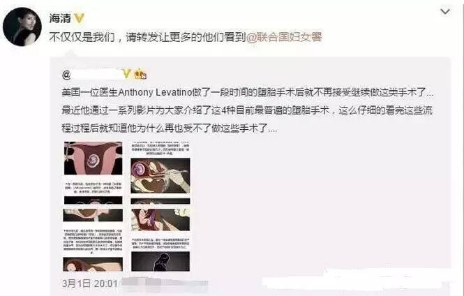 1日晚间,有微博网友发表一美国医生为何自愿停止堕胎手术内因的文章,文内还介绍了堕胎给女性身体带来的严重危害。作为妇女署大使的海清2日凌晨也转发该文,呼吁能停止堕胎行为和相关手术,她写道“不仅仅是我们,请转发让更多的他们看到。”