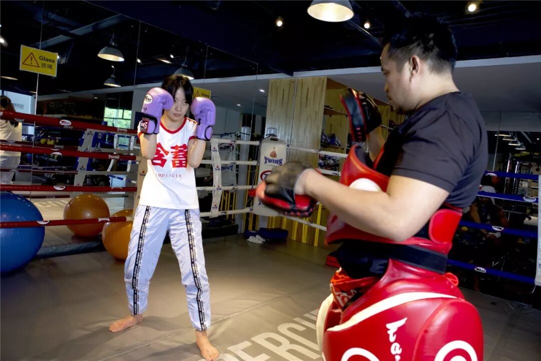 首先是热身运动,活动筋骨,李梦的眼神看上去宛若失焦。紧接着学习出拳,面对立式沙袋,她的眼神凌厉起来,手臂伸得都挺稳。
