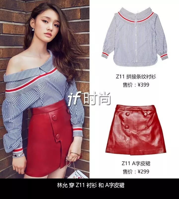 今年非常流行的一字肩条纹衬衫,搭配红色皮裙,if 姐亲测巨显腿长,还有些小心机的性感。