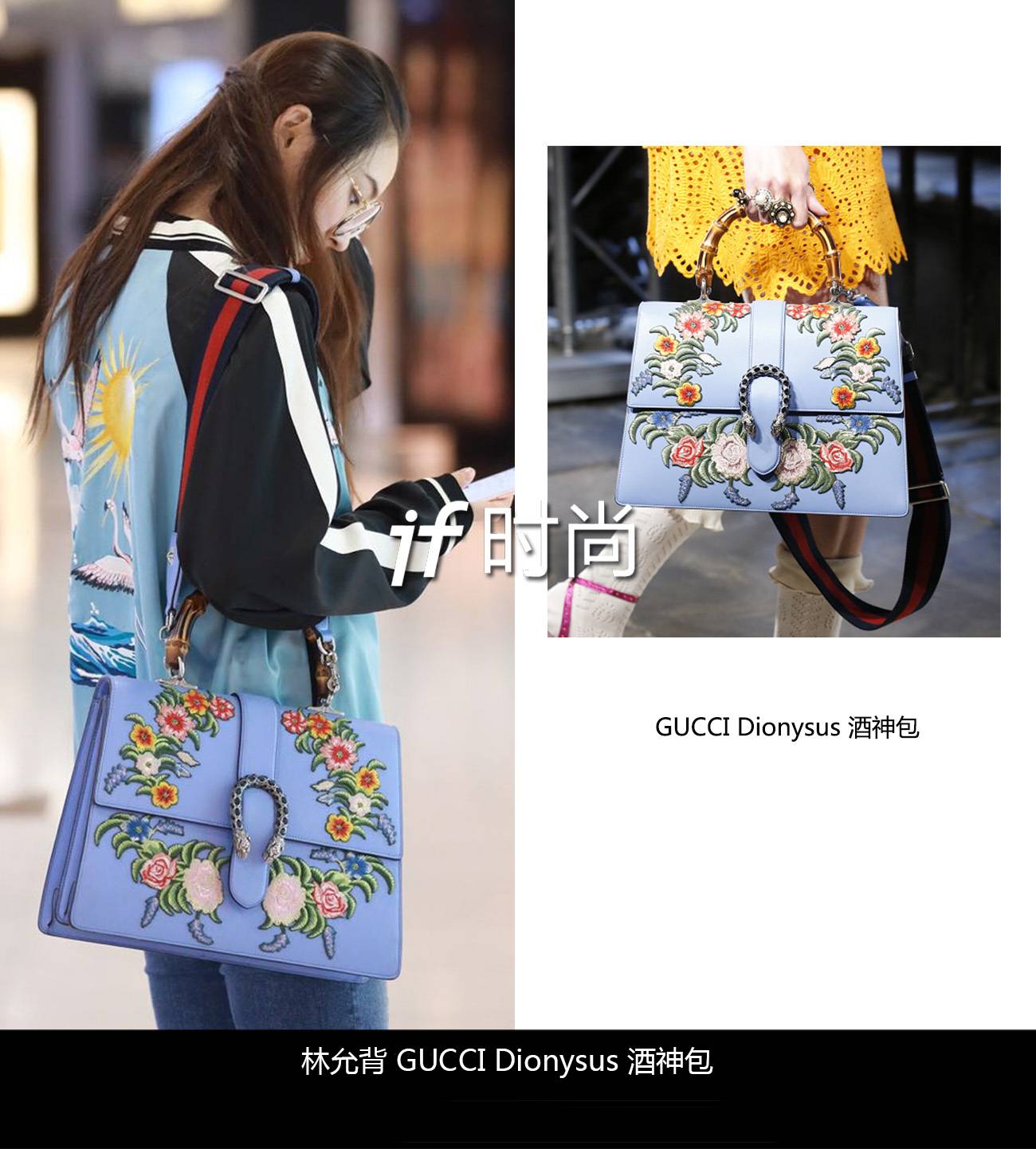 酒神绝对能称作Gucci 新经典,水蓝色和花朵元素,配上酒神特有的竹节和蛇头扣,清新碰撞复古。