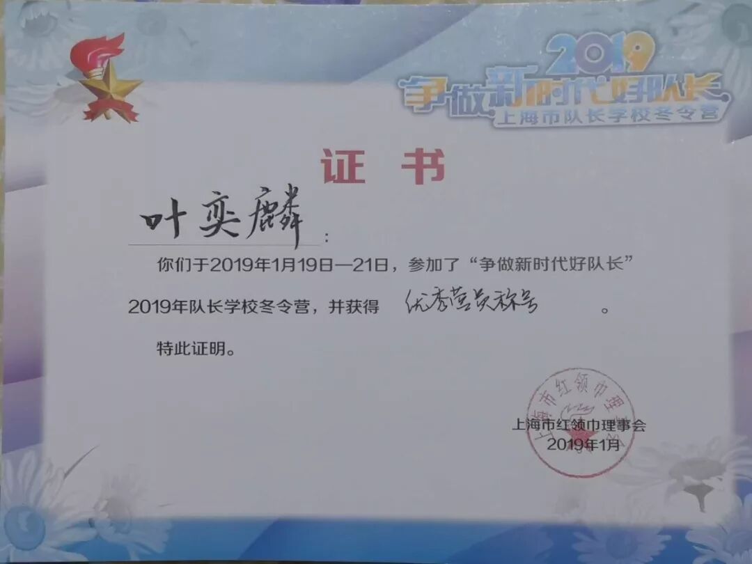 恭喜叶奕麟同学在本次上海市队长学校冬令营中获得了“优秀营员”称号!