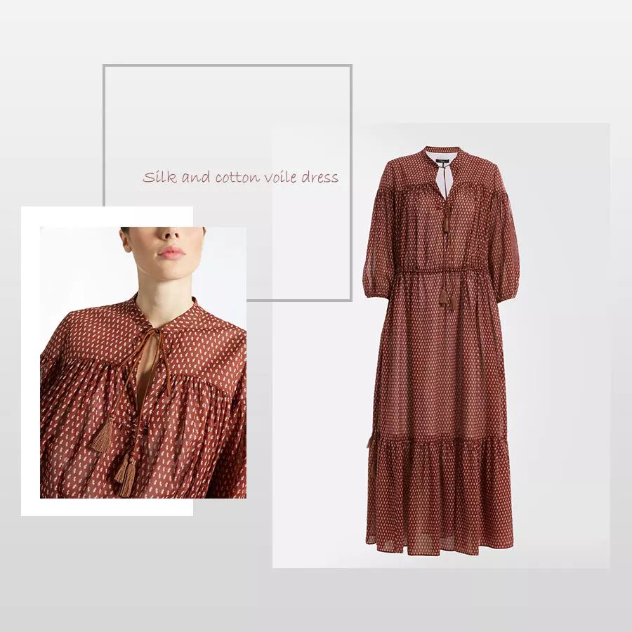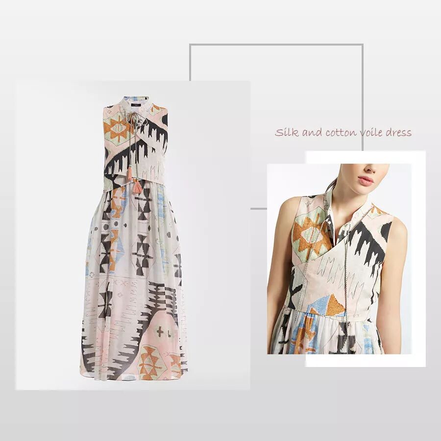 迷笛无袖连衣裙采用了棉纱和印花丝绸布料,顶部设计了独特的延至腰部的两个腰带的交叉,在背部聚拢相系,塑造挺拔身姿,带有花边和流苏的小和服领既优雅又灵动。