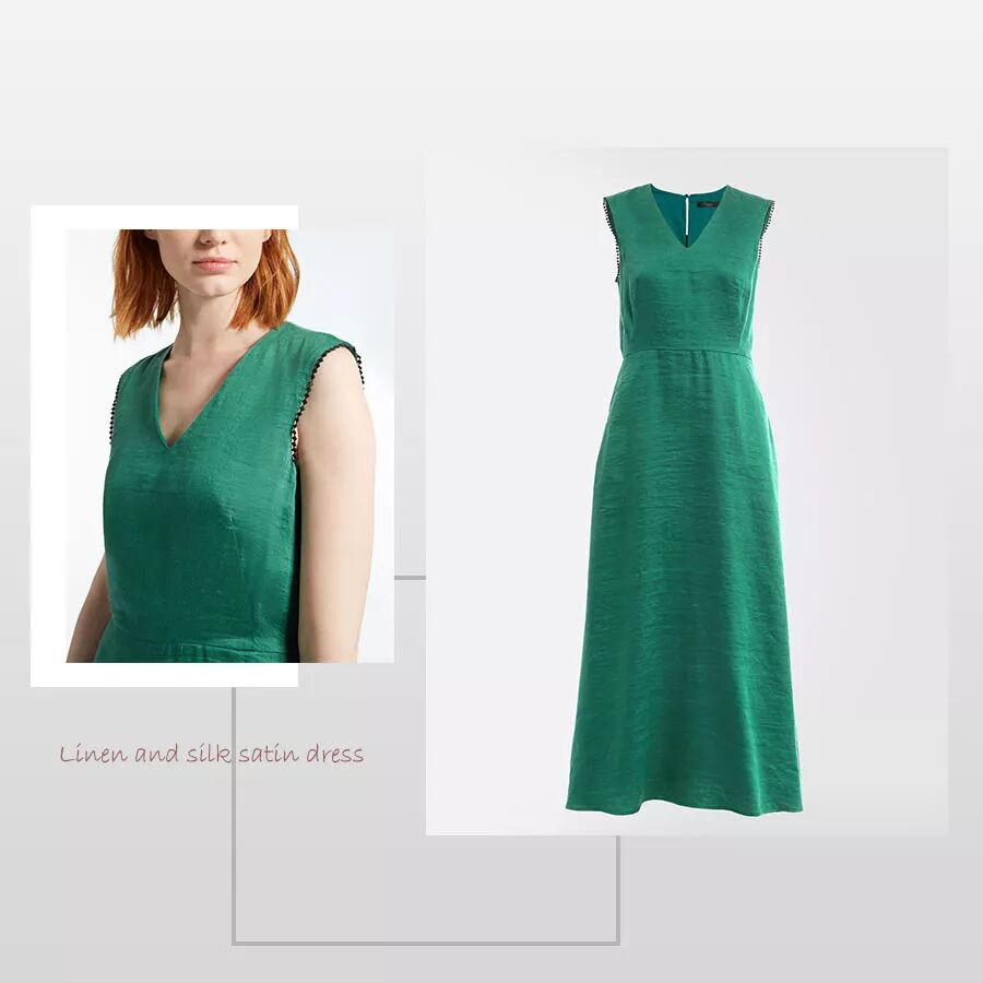 简约的设计在第一眼就击中人心,采用亚麻和绸缎布料,在阳光下散发出柔和的光泽。正面设计为v领造型,露出女孩白皙的脖颈和迷人的锁骨,背部则搭配泪滴扣固定裙身。