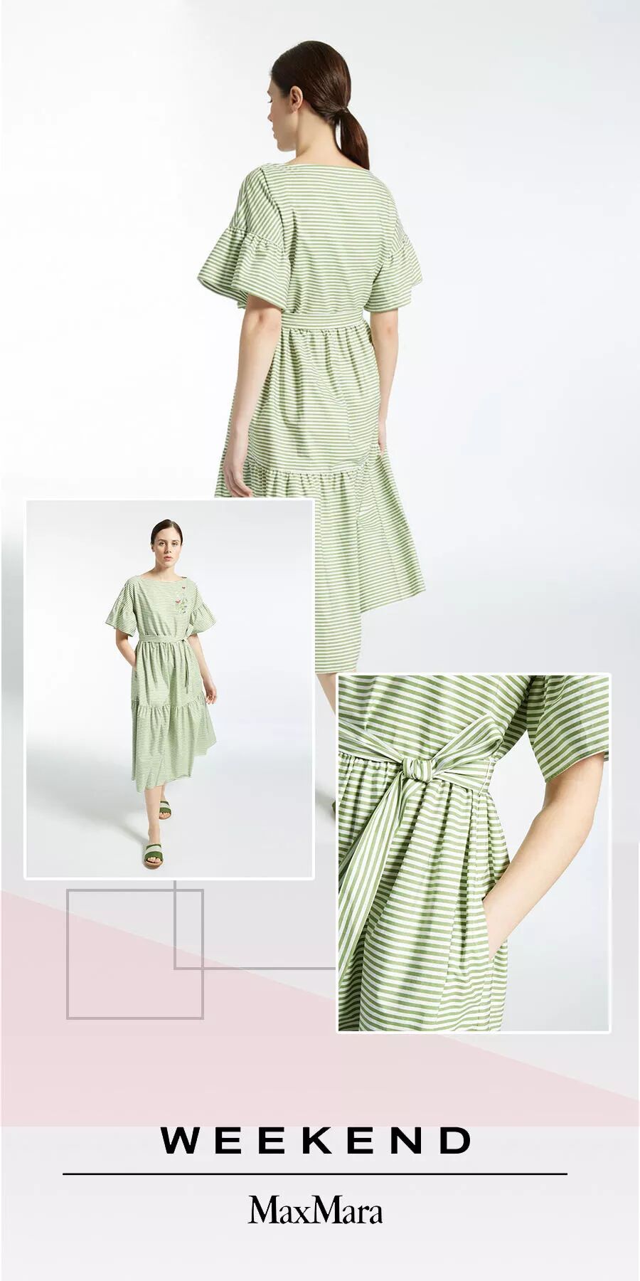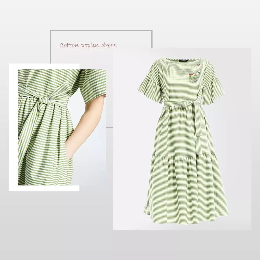 浅绿色条纹造型的超宽松棉绸中长连衣裙仿佛为春天注入了生机。连衣裙底部为两段式宽褶,腰部依然采取腰带作为收腰的方式,身材层次感一下子展现出来。